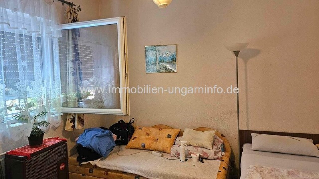 In einer Kleinstadt 12 km vom Plattensee entfernt, Dachgeschosshaus mit separatem Eingang, in ruhiger Umgebung zu verkaufen. Das 145 m² große Backsteingebäude hat isolierte Wände, teilweise mit neuen Kunststofftüren und -fenstern. Erdgeschoss: überdachte Terrasse, Wohnzimmer, 2 Schlafzimmer, Küche, Speisekammer, Bad, WC, Garage, Abstellraum. Dachgeschoss: Eingangshalle, 2 Schlafzimmer, Badezimmer, Balkon. Im Nebengebäude hinter dem Haus, separater Eingang Wohnung, Zimmer-Küche-Badezimmer. Auf der Rückseite des 660 m² großen Grundstücks befinden sich eine Werkstatt, ein Holzschuppen, ein Tauchbecken und ein Gemüsegarten. Im vorderen Teil des gepflegten Hofes befindet sich ein Carport.