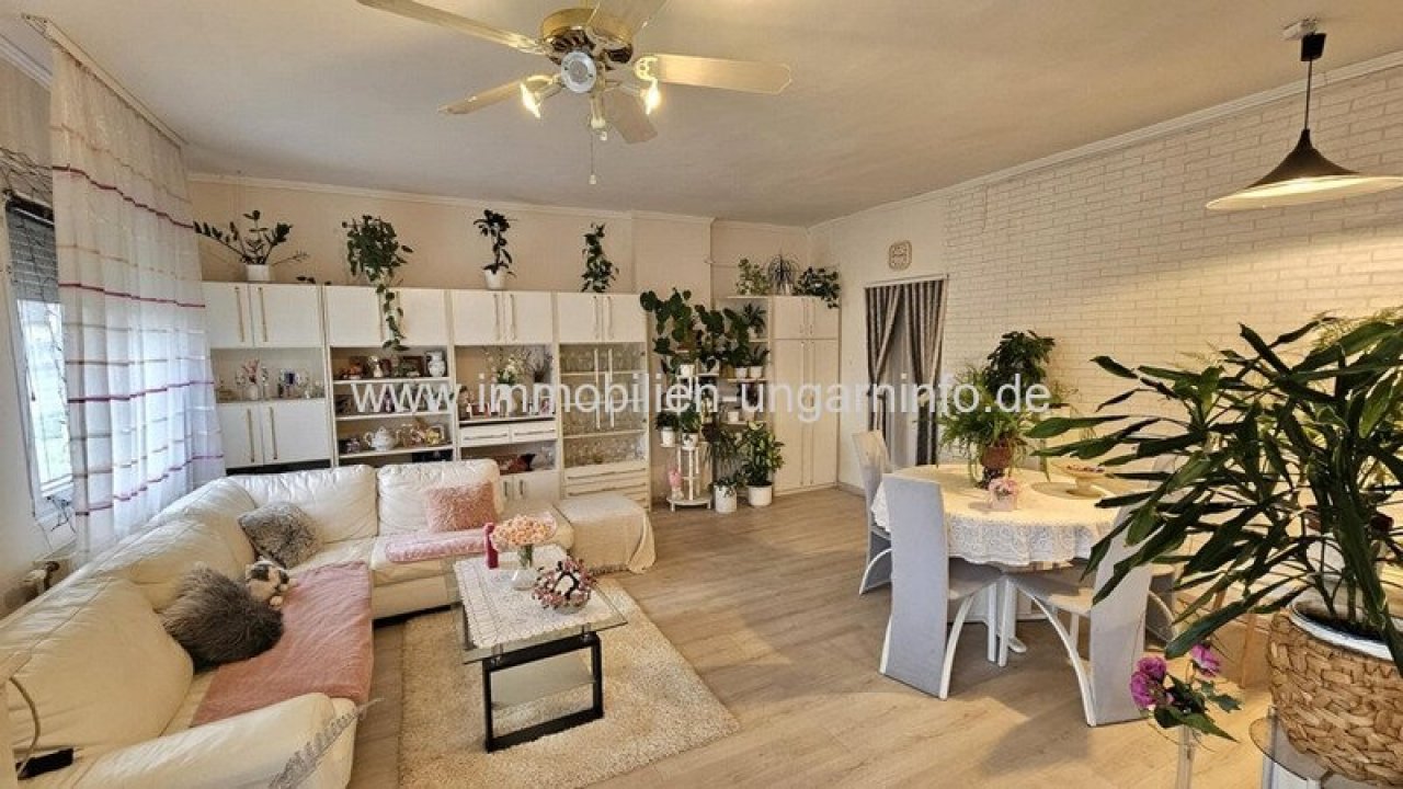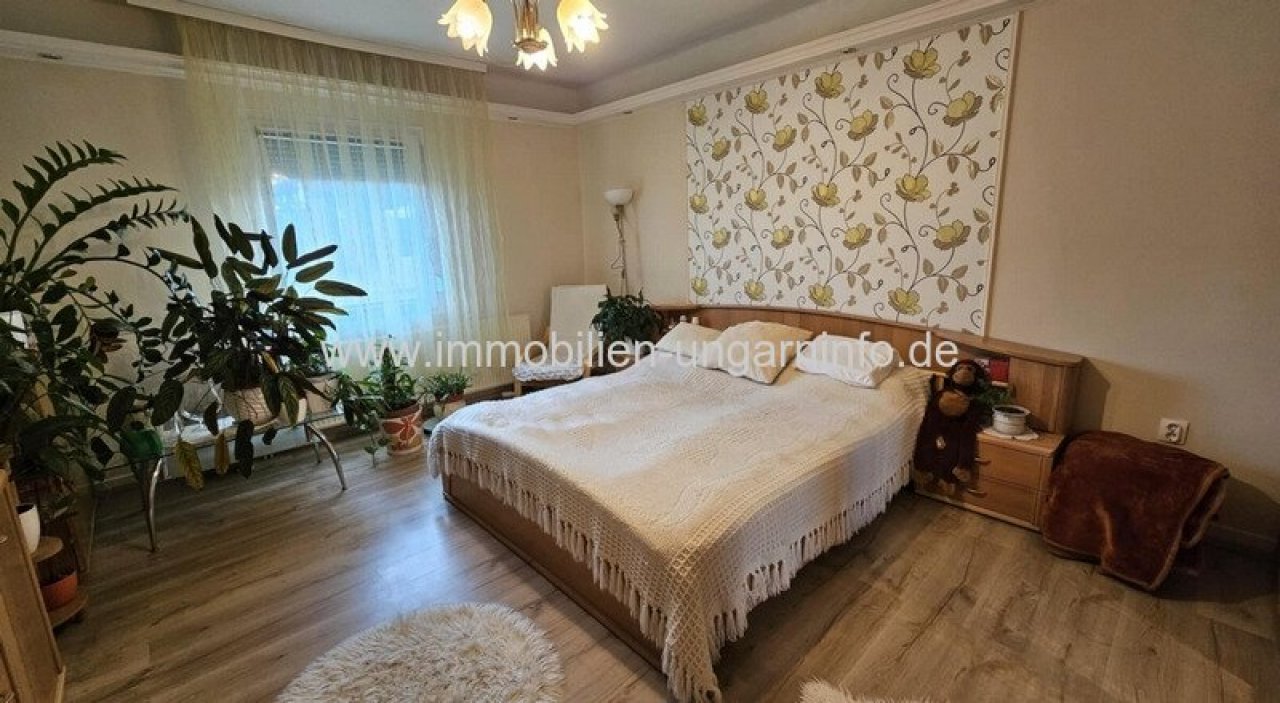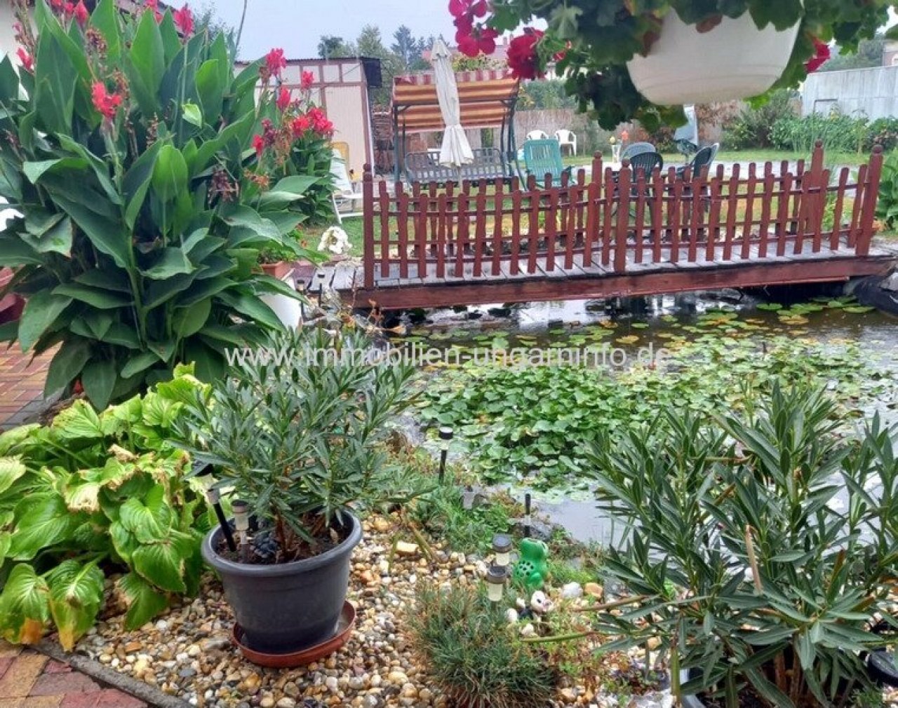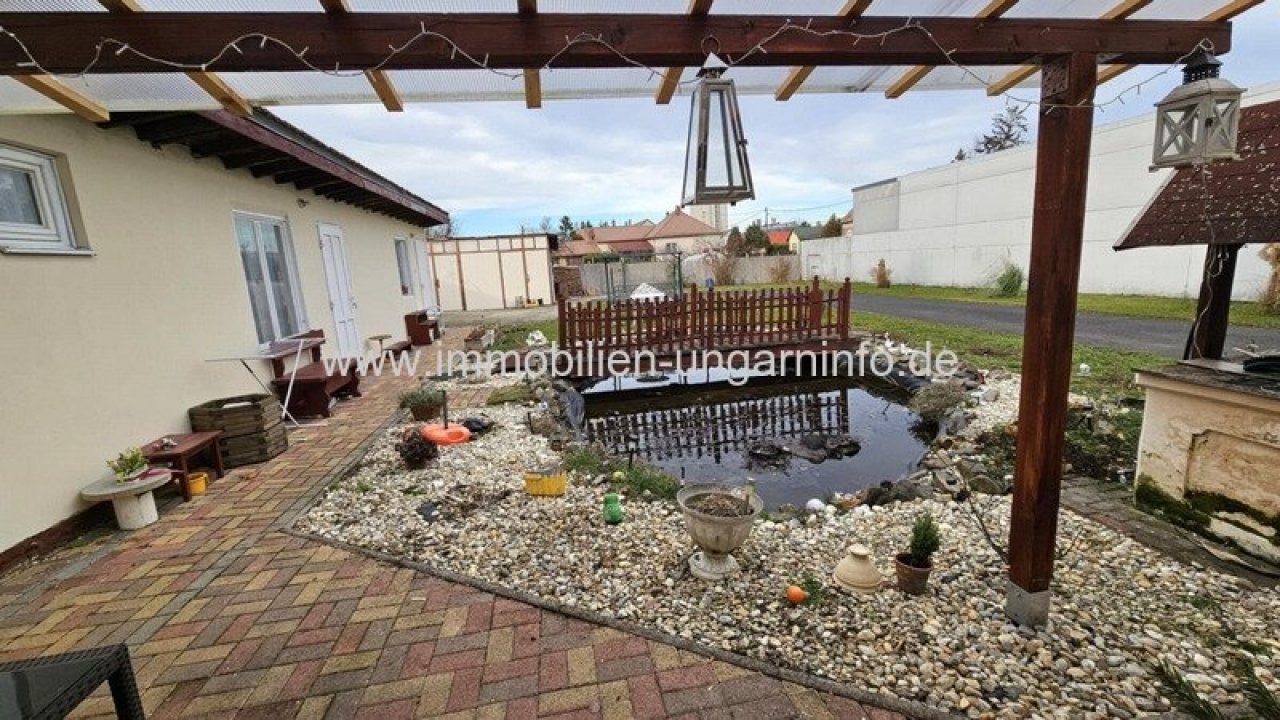 In einer kleinen Stadt in der Nähe des Plattensees biete ich ein 125 m² großes Einfamilienhaus mit einem 955 m² großen umzäunten Grundstück zum Verkauf an. Räume: Wohnzimmer, 3 Schlafzimmer, 2 Bäder, 2 Toiletten, Diele, Küche, Esszimmer, Wintergarten, überdachte Terrasse. Im Nebengebäude Sommerküche, Esszimmer, Gästezimmer, Abstellraum. An das Haus angebaut ist ein 70 m² großer Raum mit Doppelgarage, Heizungsraum, Holzlagerraum und Garderobe. Im hinteren Nebengebäude gibt es Abstellräume und eine separate Garage. Der Hof ist grasbewachsen, aufgeräumt, ein wunderschöner Gartenteich wurde angelegt, es gibt auch einen gegrabenen Brunnen. Der hintere Garten ist Obstgarten und Gemüsegarten.