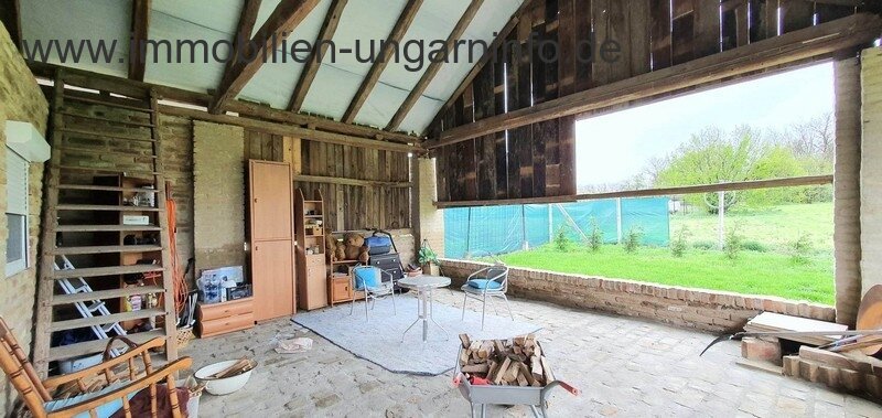 Im Zwischenraum zwischen den beiden Gebäuden gibt es einen Abstellraum und eine Sonnenterrasse. Der vordere Teil des Grundstücks ist gepflegt, grasbewachsen, eingezäunt, mit einem gegrabenen Brunnen. Im hinteren Teil des Grundstücks gibt es einen Pflug und am Ende des Grundstücks befindet sich ein Wald.