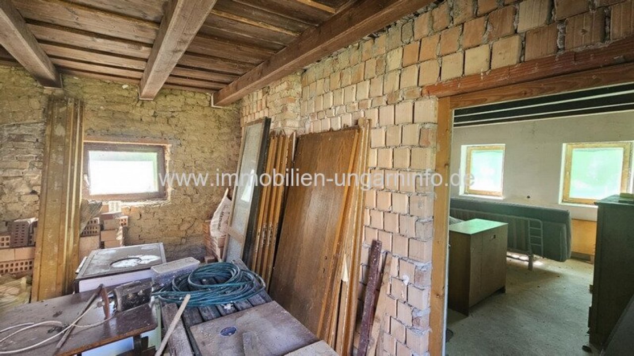 Das zweite Gebäude ist ca. 60 m² groß und muss renoviert werden. Derzeit besteht es aus 2 Räumen; der Betonboden des zur Straße hin gelegenen Raums und die authentische Balkendecke sind bereits fertiggestellt, die Gestaltung der übrigen Räume wartet auf den neuen Käufer. Im Kaufpreis enthalten sind die Einrichtung des ersten Gebäudes sowie die Fenster und Türen und andere Baumaterialien des zweiten Gebäudes.