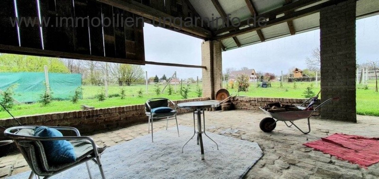 Im Zwischenraum zwischen den beiden Gebäuden gibt es einen Abstellraum und eine Sonnenterrasse. Der vordere Teil des Grundstücks ist gepflegt, grasbewachsen, eingezäunt, mit einem gegrabenen Brunnen. Im hinteren Teil des Grundstücks gibt es einen Pflug und am Ende des Grundstücks befindet sich ein Wald.