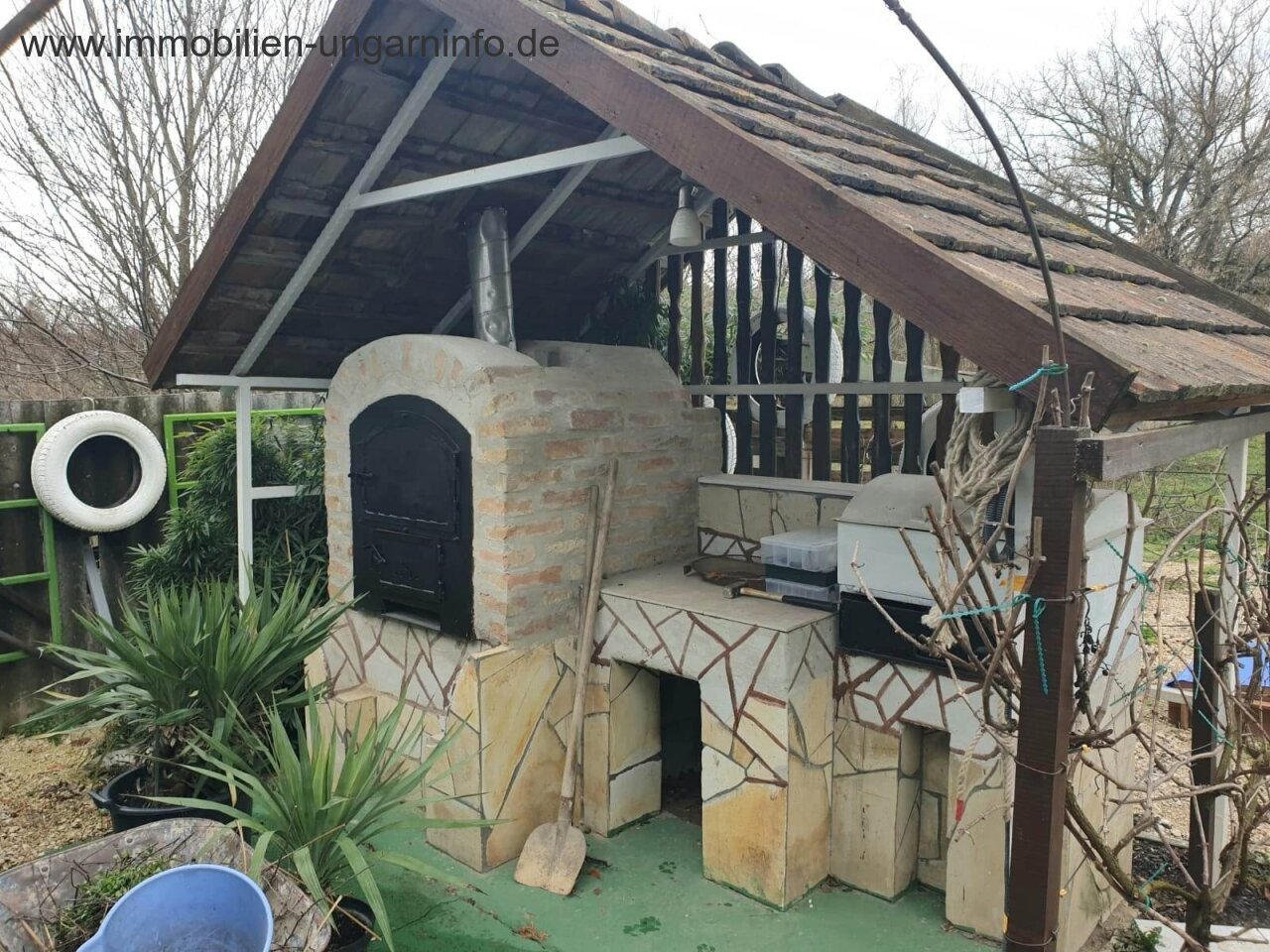 Az udvaron kültéri konyha található grillezővel, sütővel, tűzhellyel, kerti edényekkel. Az udvar füves, rendezett.